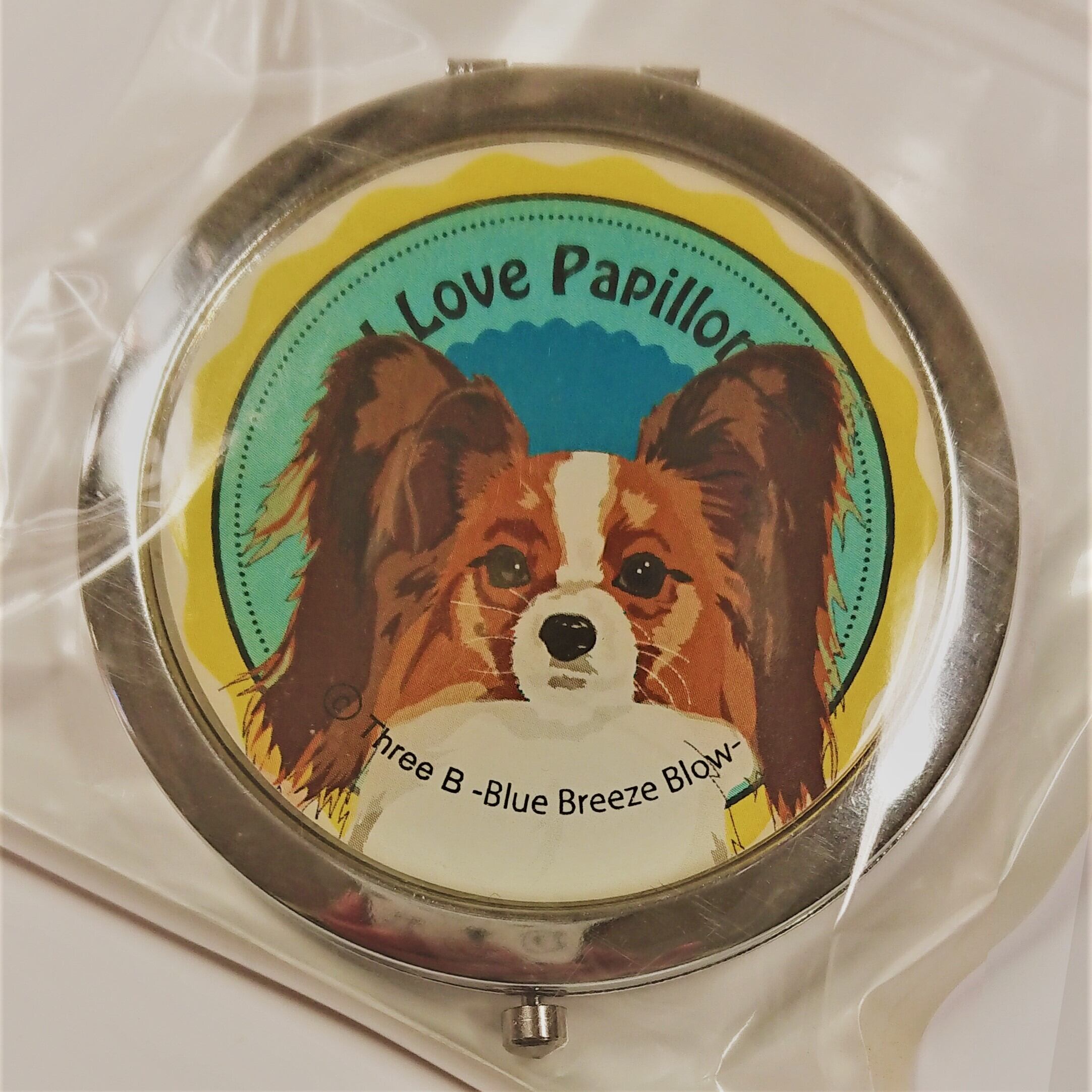 可愛い!パピヨン絵柄のコンパクトミラ―。拡大鏡付き。